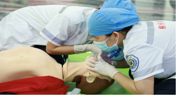 在隨后的應急救援個人技能比賽中,采用標準化病人與仿真模擬人相結合的方式,16名參賽選手嚴格遵循操作規范,用嫻熟的手法、扎實的專業功底、臨危不亂的職業素養,在心肺復蘇、環甲膜穿刺、止血包扎等項目中進行激烈比拼,爭分奪秒與 “死神”賽跑,高度還原臨床急救場景,生動詮釋了“時間就是生命”的急救理念。