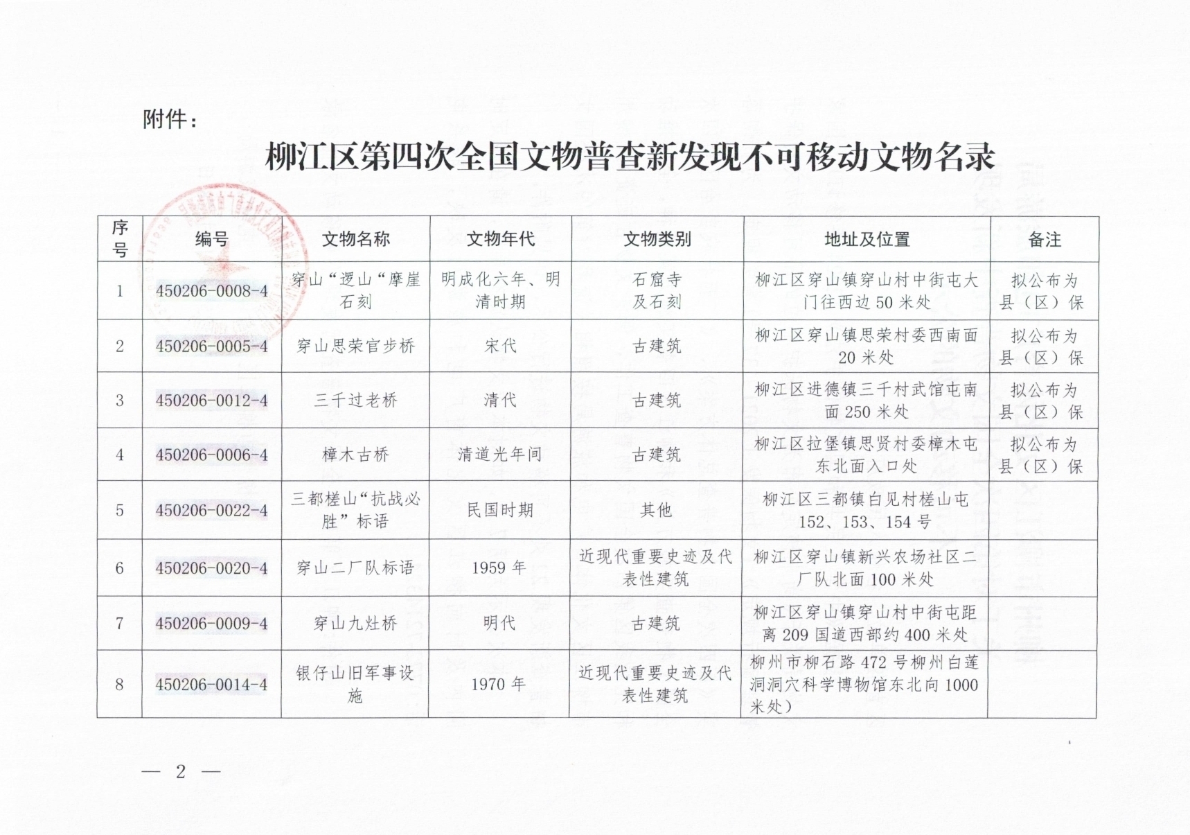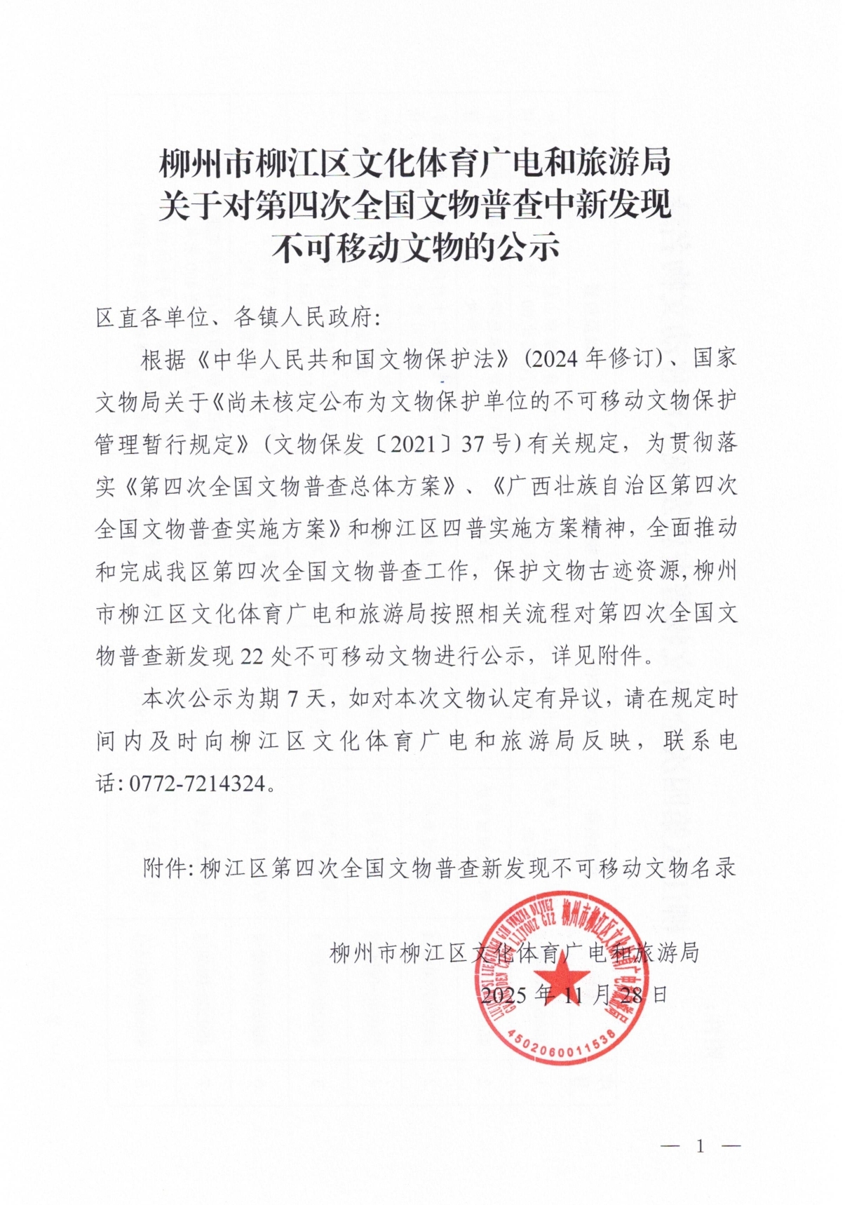柳州市柳江區文化體育廣電和旅游局關于對第四次全國文物普查中新發現不可移動文物的公示